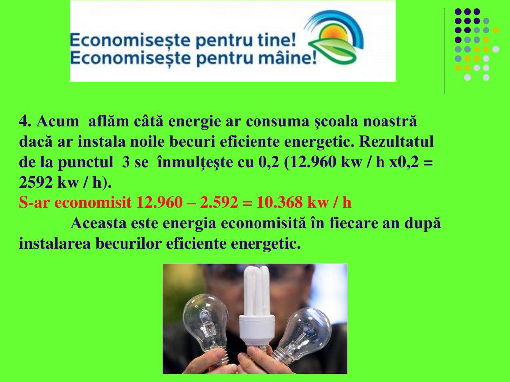 4.Acum aflăm câtă energie ar consuma şcoala noastră dacă ar instala noile becuri eficiente energetic. Rezultatul de la punctul 3 se înmulţeşte cu 0,2 (12.960 kw / h x0,2 = 2592kw / h).S-ar economisit 12.960 – 2.592 = 10.368 kw / hAceasta este energia economisită în fiecare an după instalarea becurilor eficiente energetic.