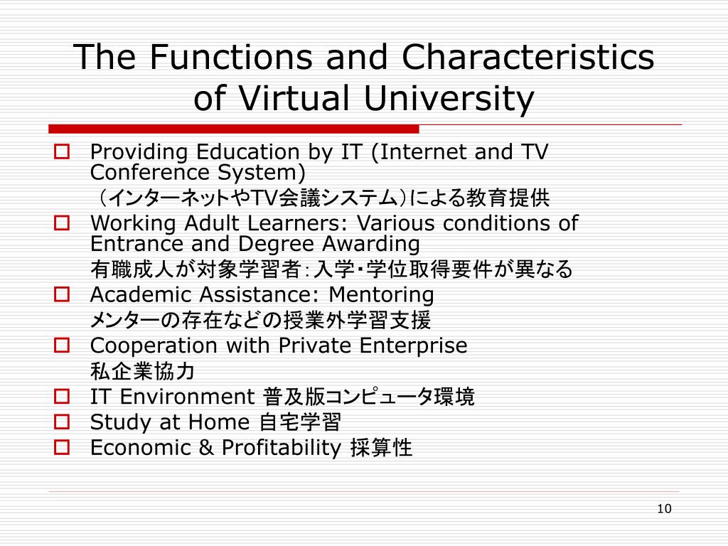 The Functions and Characteristicsof Virtual University • Providing Education by IT (Internet and TV Conference System) (インターネットやTV会議システム)による教育提供 • Working Adult Learners: Various conditions of Entrance and Degree Awarding 有職成人が対象学習者:入学・学位取得要件が異なる • Academic Assistance: Mentoring メンターの存在などの授業外学習支援 • Cooperation with Private Enterprise 私企業協力 • IT Environment 普及版コンピュータ環境 • Study at Home 自宅学習 • Economic & Profitability 採算性