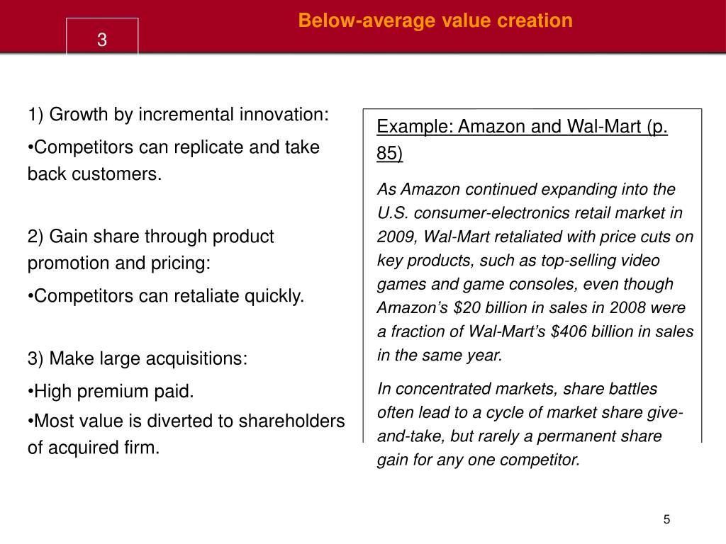 3 Below-average value creation • 1) Growth by incremental innovation: • Competitors can replicate and take back customers. • 2) Gain share through product promotion and pricing: • Competitors can retaliate quickly. • 3) Make large acquisitions: • High premium paid. • Most value is diverted to shareholders of acquired firm. Example: Amazon and Wal-Mart (p. 85) As Amazon continued expanding into the U.S. consumer-electronics retail market in 2009, Wal-Mart retaliated with price cuts on key products, such as top-selling video games and game consoles, even though Amazon’s $20 billion in sales in 2008 were a fraction of Wal-Mart’s $406 billion in sales in the same year. In concentrated markets, share battles often lead to a cycle of market share give-and-take, but rarely a permanent share gain for any one competitor.