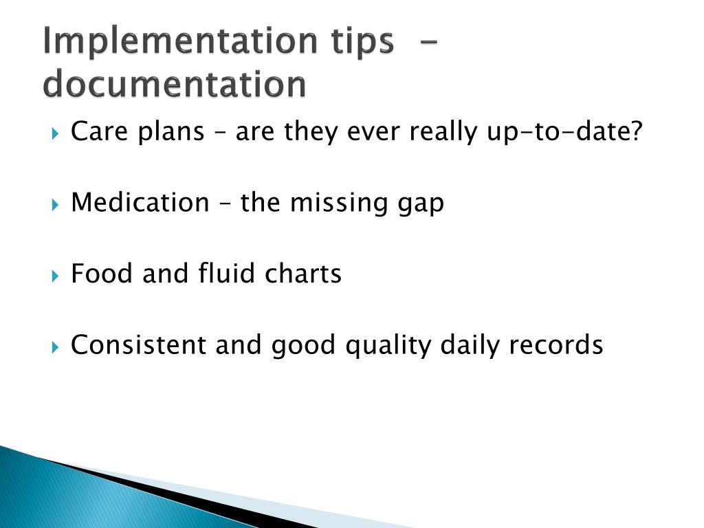 Implementation tips - documentation • Care plans – are they ever really up-to-date? • Medication – the missing gap • Food and fluid charts • Consistent and good quality daily records