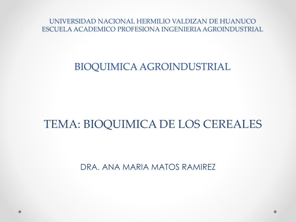 UNIVERSIDAD NACIONAL HERMILIO VALDIZAN DE HUANUCOESCUELA ACADEMICO PROFESIONA INGENIERIA AGROINDUSTRIALBIOQUIMICA AGROINDUSTRIAL TEMA: BIOQUIMICA DE LOS CEREALES DRA. ANA MARIA MATOS RAMIREZ