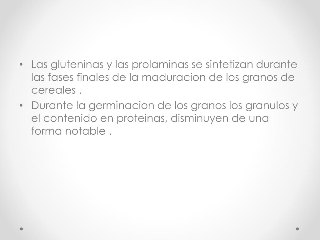 Las gluteninas y las prolaminas se sintetizan durante las fases finales de la maduracion de los granos de cereales . • Durante la germinacion de los granos los granulos y el contenido en proteinas, disminuyen de una forma notable .