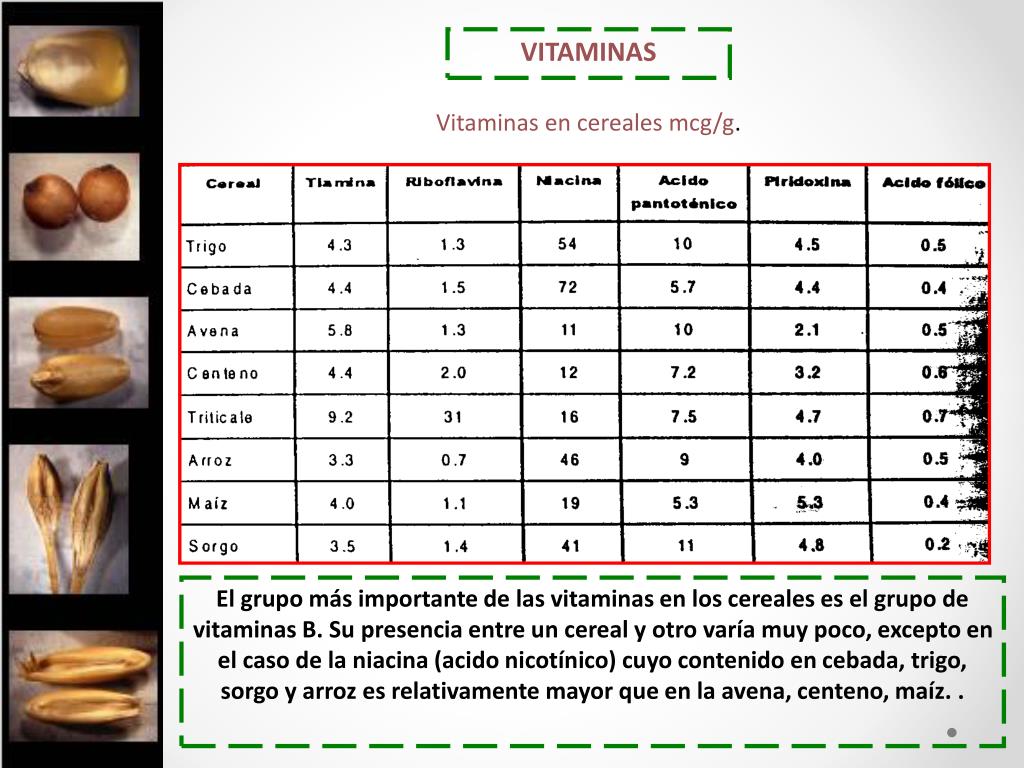 VITAMINAS Vitaminas en cereales mcg/g. El grupo más importante de las vitaminas en los cereales es el grupo de vitaminas B. Su presencia entre un cereal y otro varía muy poco, excepto en el caso de la niacina (acido nicotínico) cuyo contenido en cebada, trigo, sorgo y arroz es relativamente mayor que en la avena, centeno, maíz..
