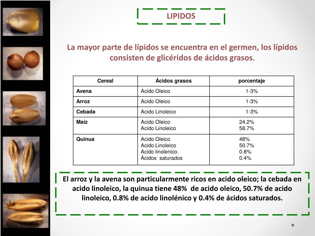 LIPIDOS La mayor parte de lípidos se encuentra en el germen, los lípidos consisten de glicéridos de ácidos grasos. El arroz y la avena son particularmente ricos en acido oleico; la cebada en acido linoleico, la quinua tiene 48% de acido oleico, 50.7% de acido linoleico, 0.8% de acido linolénico y 0.4% de ácidos saturados.