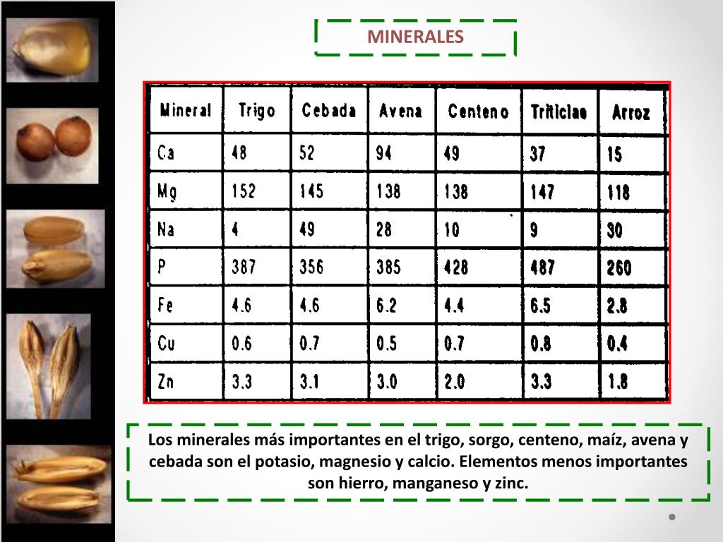 MINERALES Los minerales más importantes en el trigo, sorgo, centeno, maíz, avena y cebada son el potasio, magnesio y calcio. Elementos menos importantes son hierro, manganeso y zinc.