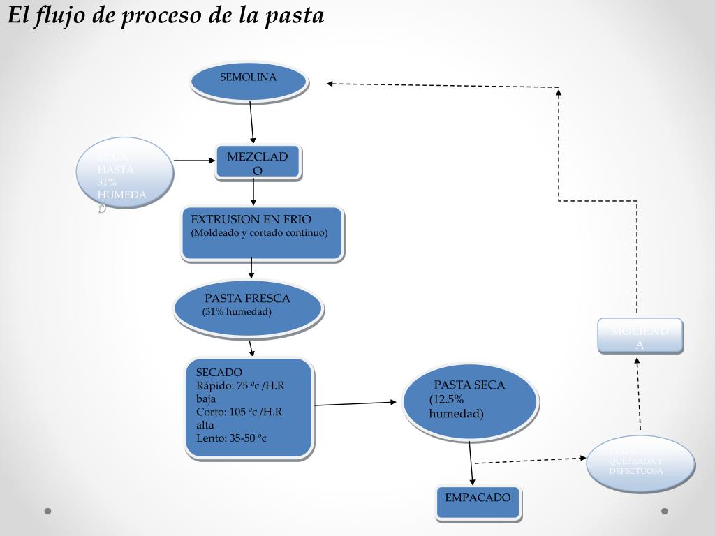 El flujo de proceso de la pasta SEMOLINA AGUA HASTA 31% HUMEDAD MEZCLADO EXTRUSION EN FRIO (Moldeado y cortado continuo) PASTA FRESCA (31% humedad) MOLIENDA SECADO Rápido: 75 ºc /H.R baja Corto: 105 ºc /H.R alta Lento: 35-50 ºc PASTA SECA (12.5% humedad) PASTA QUEBRADA Y DEFECTUOSA EMPACADO