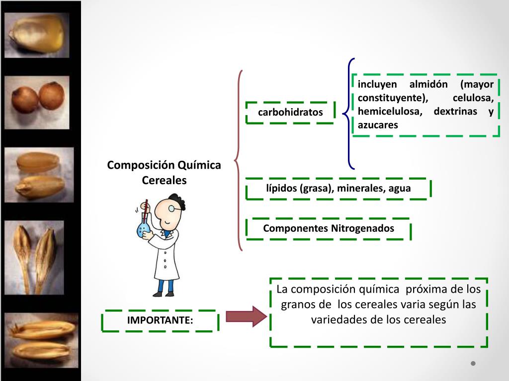 incluyen almidón (mayor constituyente), celulosa, hemicelulosa, dextrinas y azucares carbohidratos Composición Química Cereales lípidos (grasa), minerales, agua Componentes Nitrogenados La composición química próxima de los granos de los cereales varia según las variedades de los cereales IMPORTANTE: