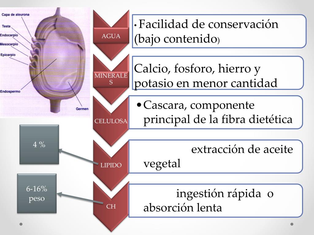 Estructura de un cereal Germen o embrión Endospermo Testa Cáscara