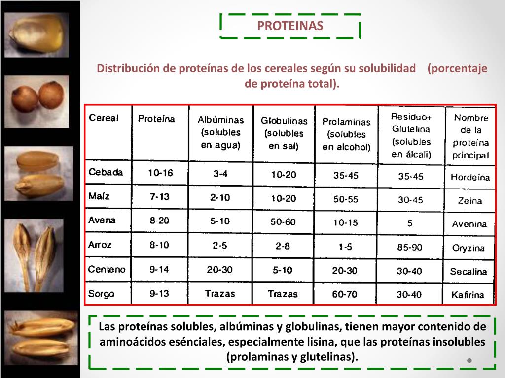 PROTEINAS Distribución de proteínas de los cereales según su solubilidad (porcentaje de proteína total). Las proteínas solubles, albúminas y globulinas, tienen mayor contenido de aminoácidos esénciales, especialmente lisina, que las proteínas insolubles (prolaminas y glutelinas).