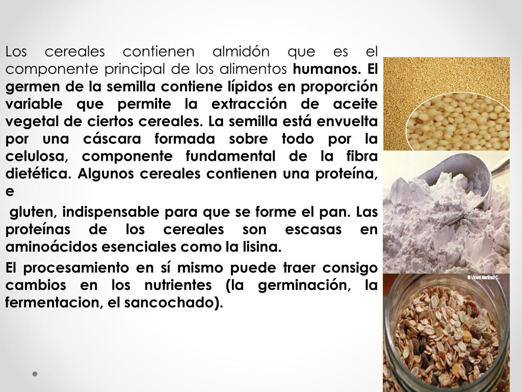 Los cereales contienen almidón que es el componente principal de los alimentos humanos. El germen de la semilla contiene lípidos en proporción variable que permite la extracción de aceite vegetal de ciertos cereales. La semilla está envuelta por una cáscara formada sobre todo por la celulosa, componente fundamental de la fibra dietética. Algunos cereales contienen una proteína, e gluten, indispensable para que se forme el pan. Las proteínas de los cereales son escasas en aminoácidos esenciales como la lisina. El procesamiento en sí mismo puede traer consigo cambios en los nutrientes (la germinación, la fermentacion, el sancochado).