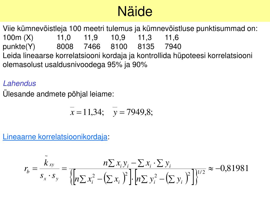 Näide Viie kümnevõistleja 100 meetri tulemus ja kümnevõistluse punktisummad on:100m (X) 11,0 11,9 10,9 11,3 11,6 punkte(Y) 8008 7466 8100 8135 7940 Leida lineaarse korrelatsiooni kordaja ja kontrollida hüpoteesi korrelatsiooni olemasolust usaldusnivoodega 95% ja 90% Lahendus Ülesande andmete põhjal leiame: Lineaarne korrelatsioonikordaja: