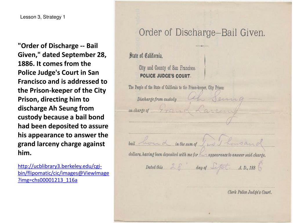 "Order of Discharge -- Bail Given," dated September 28, 1886. It comes from the Police Judge's Court in San Francisco and is addressed to the Prison-keeper of the City Prison, directing him to discharge Ah Seung from custody because a bail bond had been deposited to assure his appearance to answer the grand larceny charge against him. Lesson 3, Strategy 1 http://ucblibrary3.berkeley.edu/cgi-bin/flipomatic/cic/images@ViewImage?img=chs00001213_116a