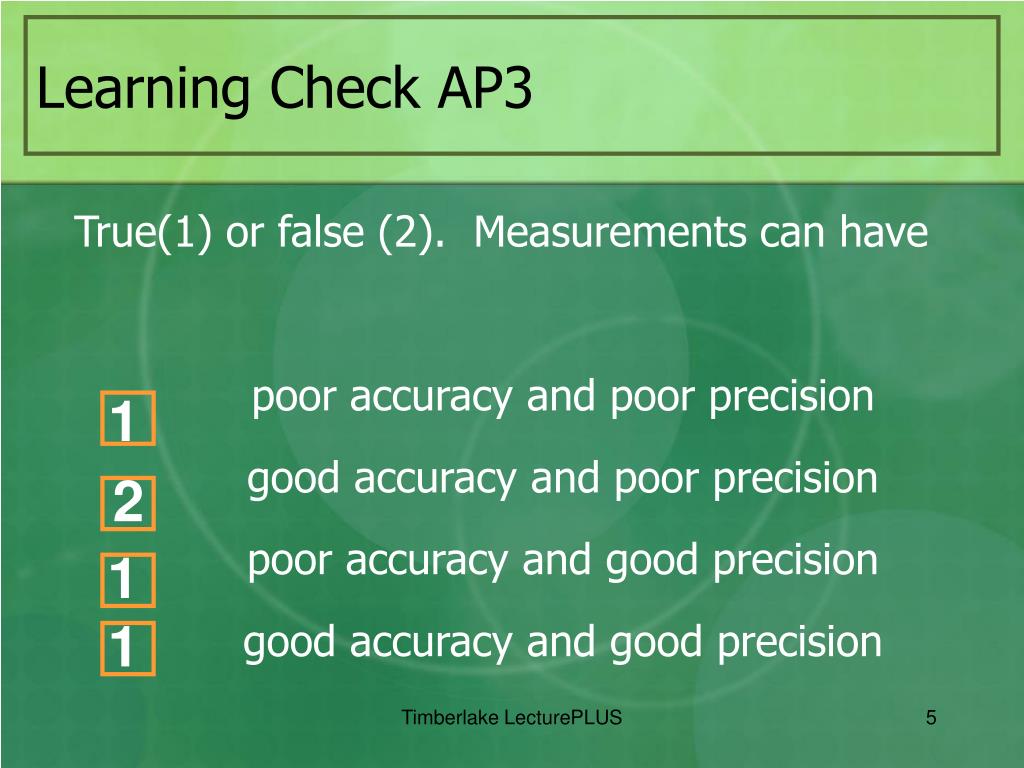 Learning Check AP3 True(1) or false (2). Measurements can have poor accuracy and poor precision good accuracy and poor precision poor accuracy and good precision good accuracy and good precision 1 2 1 1 Timberlake LecturePLUS 5