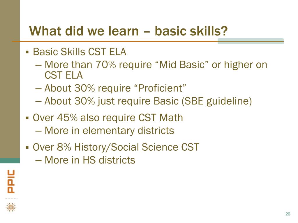 What did we learn – basic skills? • Basic Skills CST ELA • More than 70% require “Mid Basic” or higher on CST ELA • About 30% require “Proficient” • About 30% just require Basic (SBE guideline) • Over 45% also require CST Math • More in elementary districts • Over 8% History/Social Science CST • More in HS districts