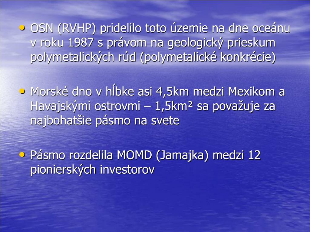 OSN (RVHP) pridelilo toto územie na dne oceánu v roku 1987 s právom na geologický prieskum polymetalických rúd (polymetalickékonkrécie) • Morské dno v hĺbke asi 4,5km medzi Mexikom a Havajskými ostrovmi – 1,5km² sa považuje za najbohatšie pásmo na svete • Pásmo rozdelila MOMD (Jamajka) medzi 12 pionierských investorov