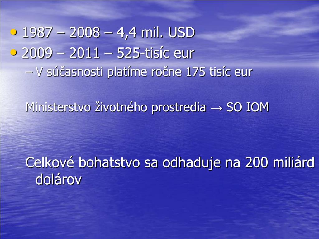 1987 – 2008 – 4,4 mil. USD • 2009 – 2011 – 525-tisíc eur • V súčasnosti platíme ročne 175 tisíc eur Ministerstvo životného prostredia → SO IOM Celkové bohatstvo sa odhaduje na 200 miliárd dolárov