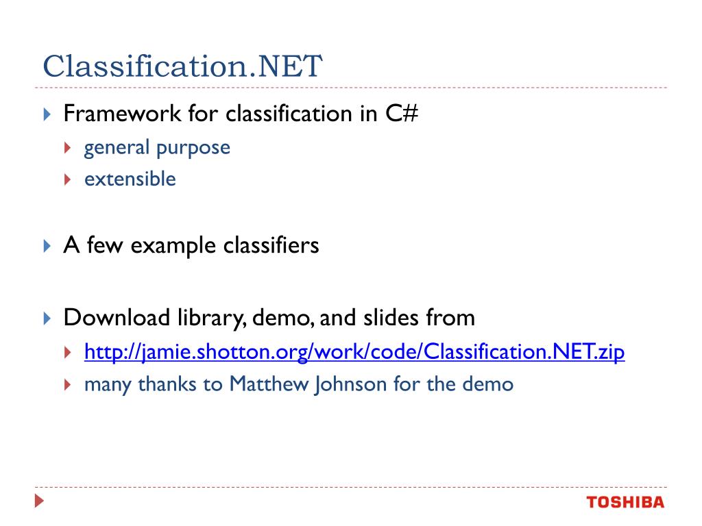 Classification.NET: Efficient and Accurate Classification in C#. Jamie Shotton Toshiba Corporate Research & Development Center, Japan. http://jamie.shotton.org/work/code/Classification.NET.zip. Introduction. This tutorial gives brief introduction to classification theory