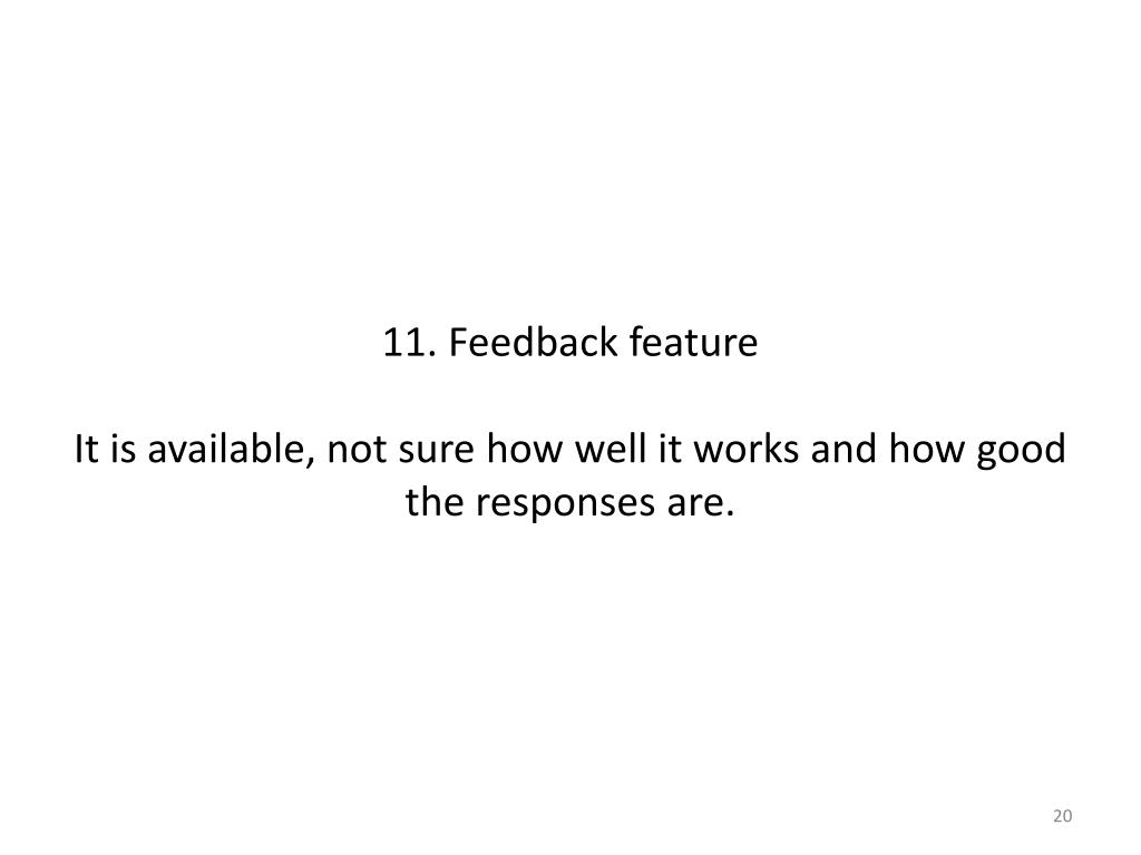 11. Feedback featureIt is available, not sure how well it works and how good the responses are.