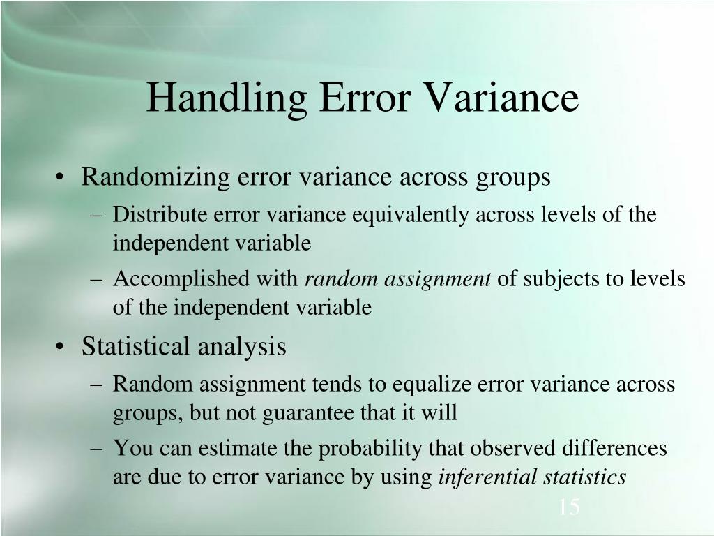 Randomizing error variance across groups Distribute error variance equivalently across levels of the independent variable Accomplished with random assignment of subjects to levels of the independent variable Statistical analysis Random assignment tends to equalize error variance across groups, but not guarantee that it will You can estimate the probability that observed differences are due to error variance by using inferential statistics Handling Error Variance
