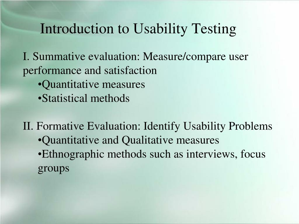 Introduction to Usability Testing • I. Summative evaluation: Measure/compare user performance and satisfaction • Quantitative measures • Statistical methods • II. Formative Evaluation: Identify Usability Problems • Quantitative and Qualitative measures • Ethnographic methods such as interviews, focus groups