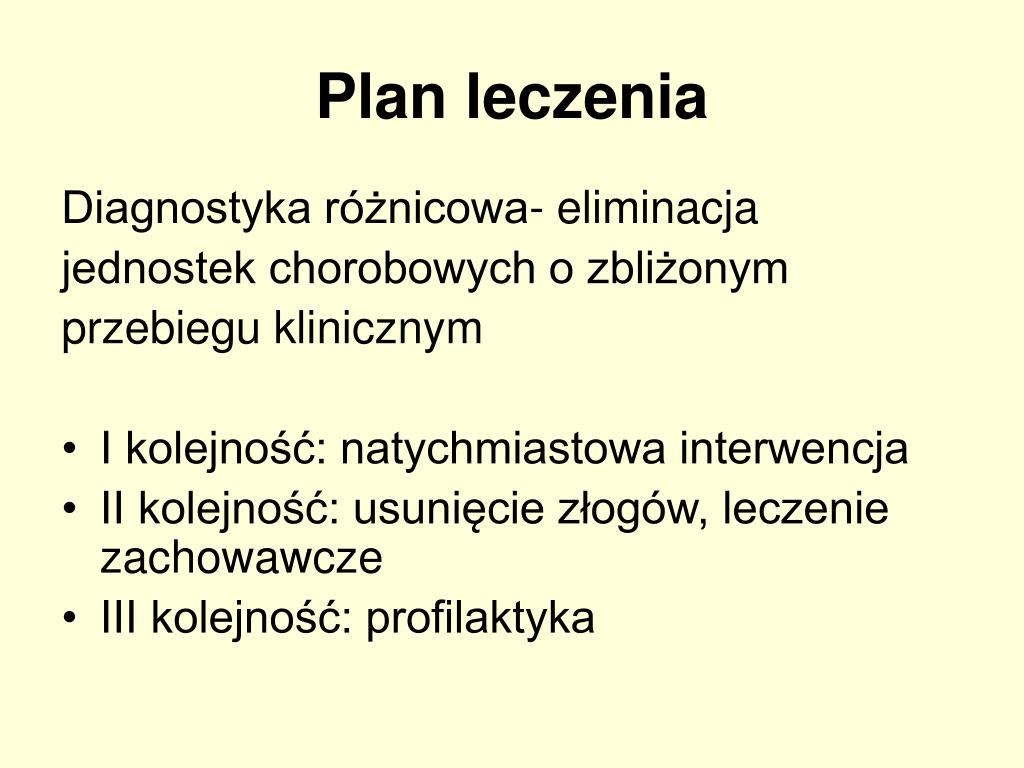 Plan leczenia Diagnostyka różnicowa- eliminacja jednostek chorobowych o zbliżonym przebiegu klinicznym • I kolejność: natychmiastowa interwencja • II kolejność: usunięcie złogów, leczenie zachowawcze • III kolejność: profilaktyka