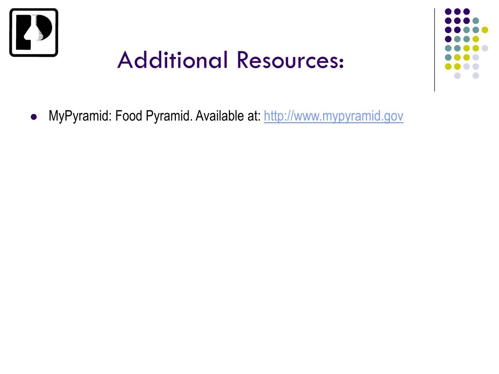 Additional Resources: • MyPyramid: Food Pyramid. Available at: http://www.mypyramid.gov