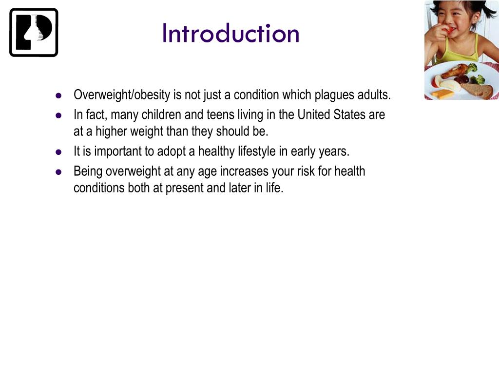 Introduction • Overweight/obesity is not just a condition which plagues adults. • In fact, many children and teens living in the United States are at a higher weight than they should be. • It is important to adopt a healthy lifestyle in early years. • Being overweight at any age increases your risk for health conditions both at present and later in life.