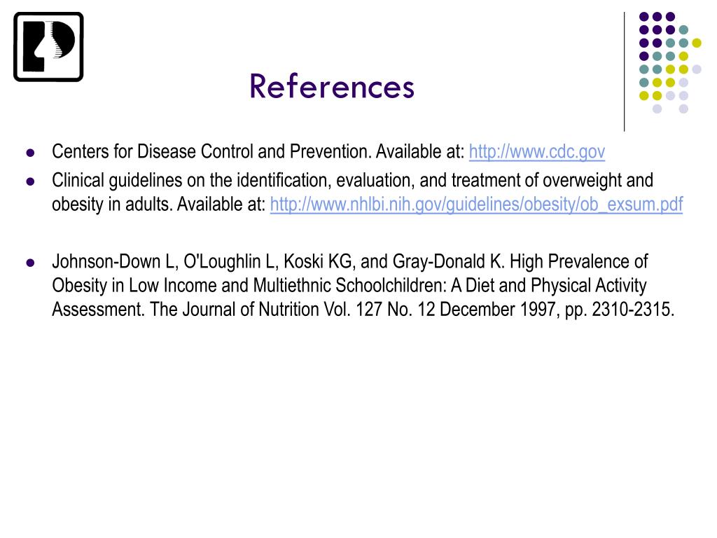 References • Centers for Disease Control and Prevention. Available at: http://www.cdc.gov • Clinical guidelines on the identification, evaluation, and treatment of overweight and obesity in adults. Available at: http://www.nhlbi.nih.gov/guidelines/obesity/ob_exsum.pdf • Johnson-Down L, O'Loughlin L, Koski KG, and Gray-Donald K. High Prevalence of Obesity in Low Income and Multiethnic Schoolchildren: A Diet and Physical Activity Assessment. The Journal of Nutrition Vol. 127 No. 12 December 1997, pp. 2310-2315.