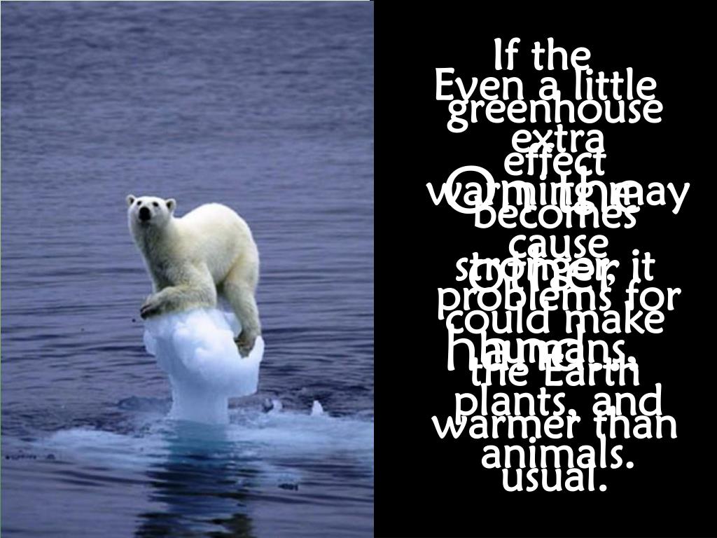 Even a little extra warming may cause problems for humans, plants, and animals. If the greenhouse effect becomes stronger, it could make the Earth warmer than usual. On the other hand...
