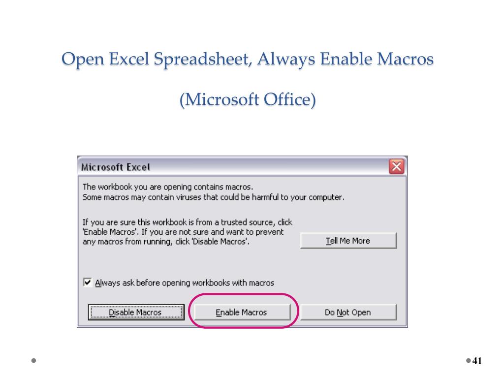 Open Excel Spreadsheet, Always Enable Macros(Microsoft Office 2003) MACROS: Upon opening the Excel Spreadsheet, always click Enable. You may need to lower security in order to enable Macros. • Go to Tools • Macros • Security • Low