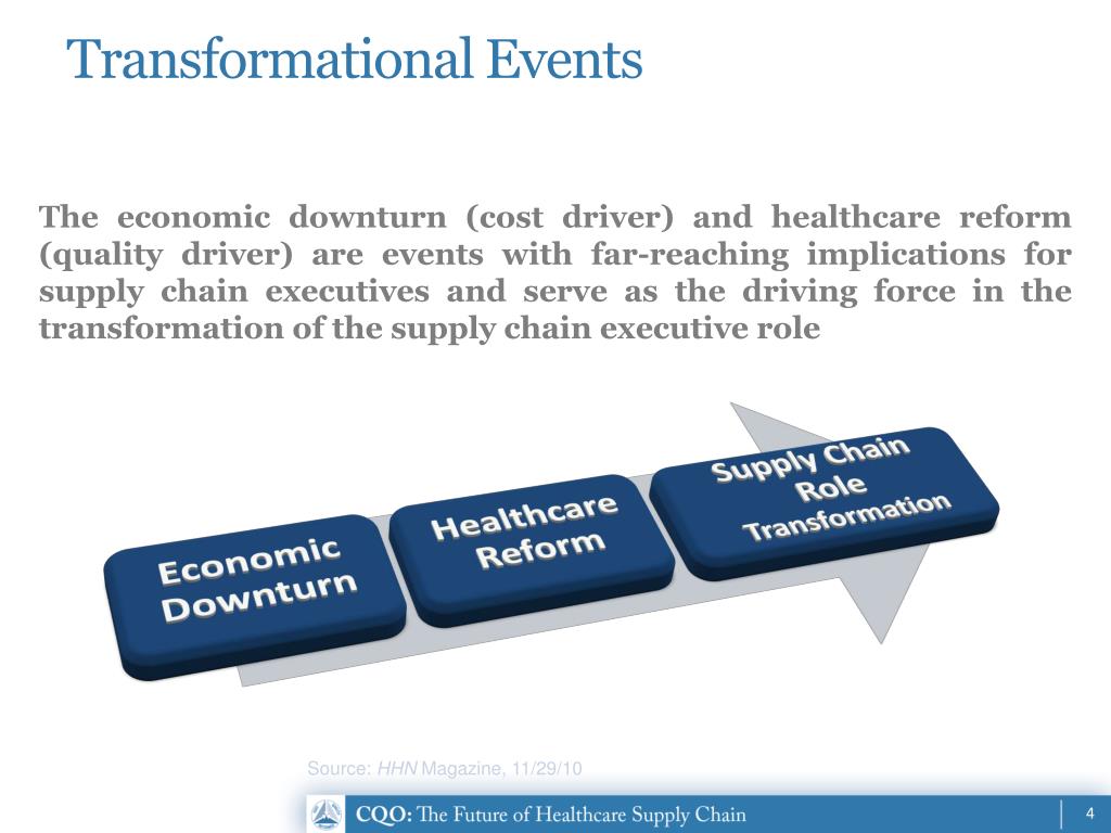 Transformational Events The economic downturn (cost driver) and healthcare reform (quality driver) are events with far-reaching implications for supply chain executives and serve as the driving force in the transformation of the supply chain executive role Source: HHN Magazine, 11/29/10