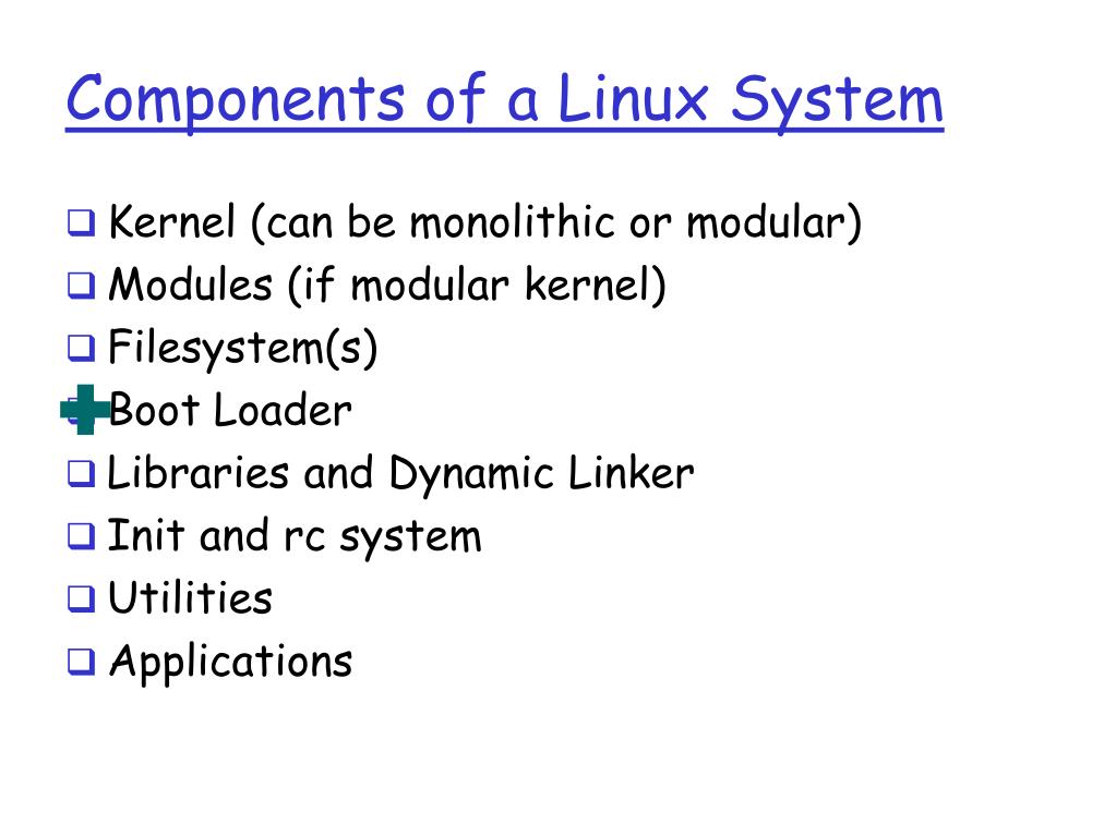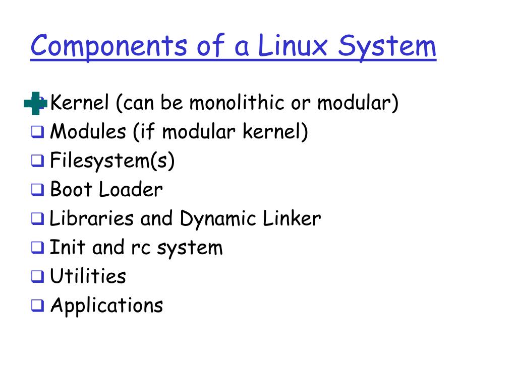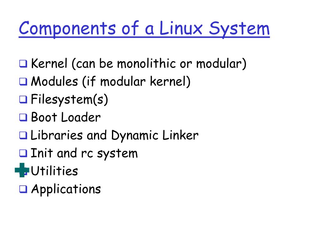 Components of a Linux System • Kernel (can be monolithic or modular) • Modules (if modular kernel) • File system(s) • Boot Loader • Libraries and Dynamic Linker • Init and rc system • Utilities • Applications