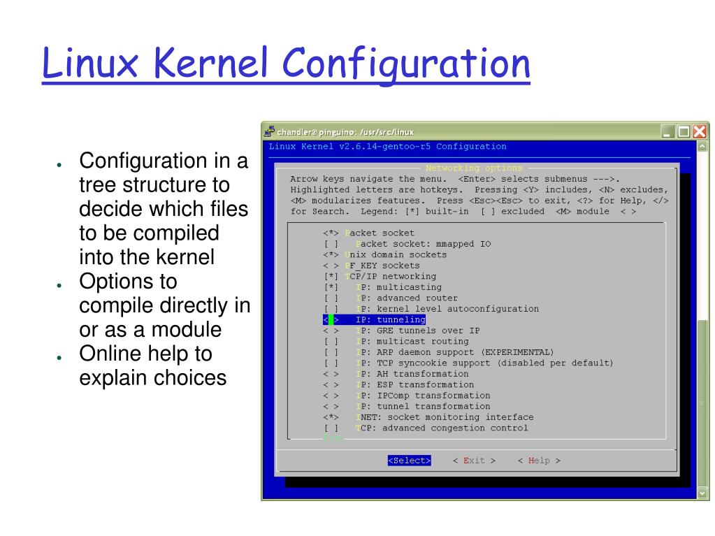 Linux Kernel Configuration • Configuration in a tree structure to decide which files to be compiled into the kernel • Options to compile directly in or as a module • Online help to explain choices