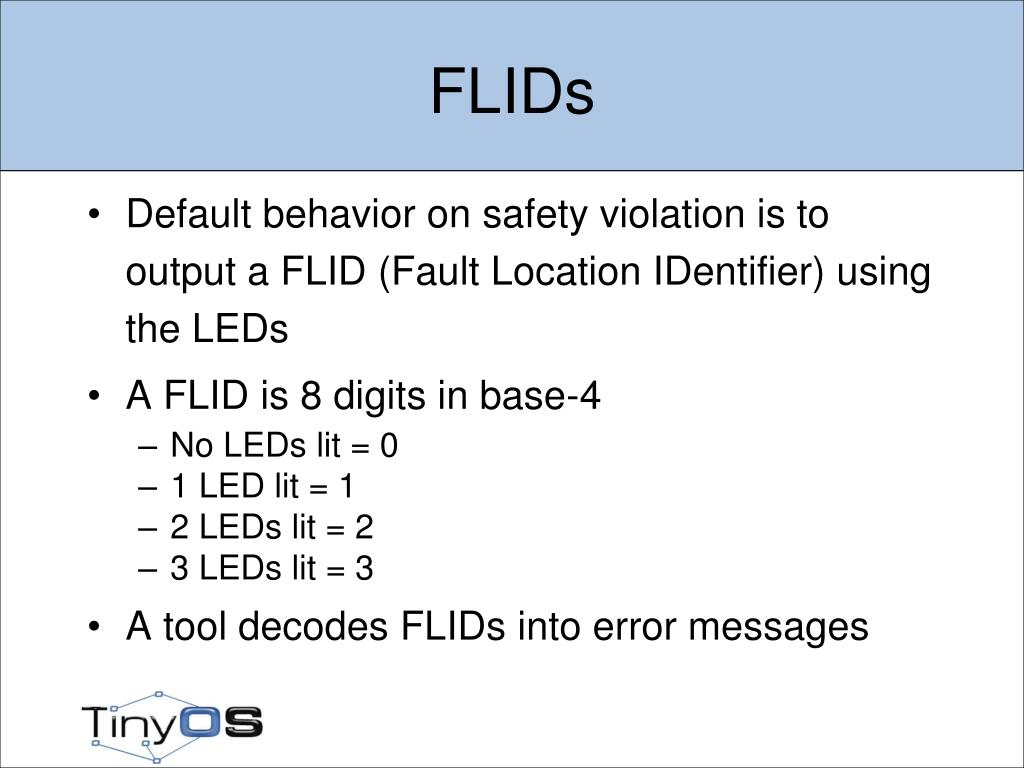 FLIDs • Default behavior on safety violation is to output a FLID (Fault Location IDentifier) using the LEDs • A FLID is 8 digits in base-4 • No LEDs lit = 0 • 1 LED lit = 1 • 2 LEDs lit = 2 • 3 LEDs lit = 3 • A tool decodes FLIDs into error messages