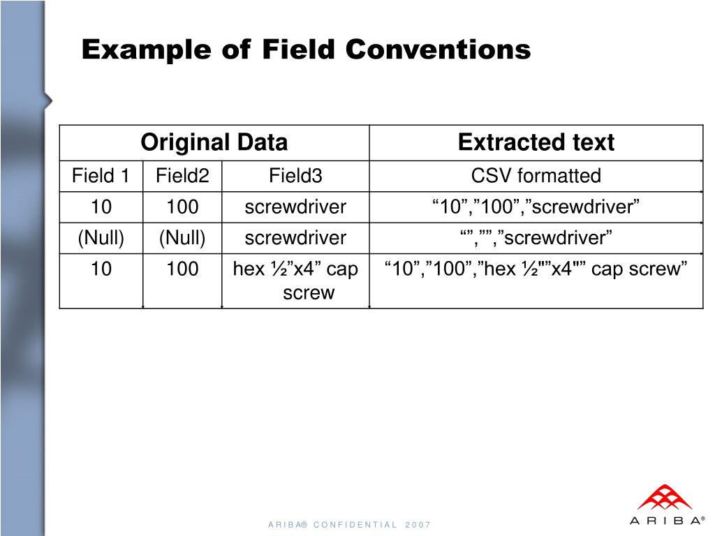Ariba Data Acquisition Schema • Provides a roadmap to create files in the proper format • Helps define the data to include for upload • Provides technical “do’s” and “don’ts” for the data extraction • Defines the various tables and fields, and the requirements for their successful creation • Is the primary and final reference for all matters relating to data extraction and file creation