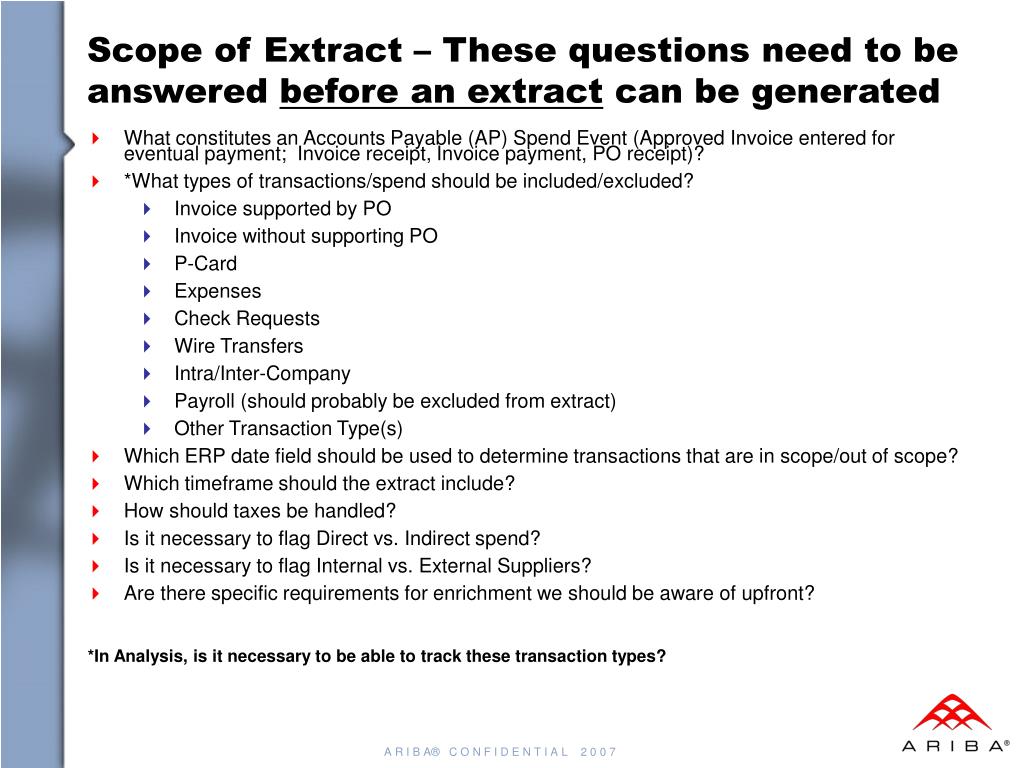 Scope of Extract – These questions need to be answered before an extract can be generated • What constitutes an Accounts Payable (AP) Spend Event (Approved Invoice entered for eventual payment; Invoice receipt, Invoice payment, PO receipt)? • *What types of transactions/spend should be included/excluded? • Invoice supported by PO • Invoice without supporting PO • P-Card • Expenses • Check Requests • Wire Transfers • Intra/Inter-Company • Payroll (should probably be excluded from extract) • Other Transaction Type(s) • Which ERP date field should be used to determine transactions that are in scope/out of scope? • Which timeframe should the extract include? • How should taxes be handled? • Is it necessary to flag Direct vs. Indirect spend? • Is it necessary to flag Internal vs. External Suppliers? • Are there specific requirements for enrichment we should be aware of upfront? *In Analysis, is it necessary to be able to track these transaction types?