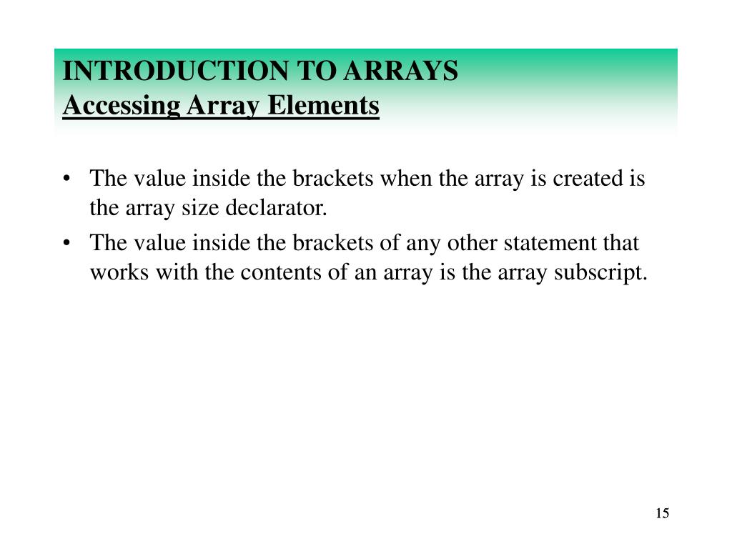 INTRODUCTION TO ARRAYSAccessing Array Elements The value inside the brackets when the array is created is the array size declarator. The value inside the brackets of any other statement that works with the contents of an array is the array subscript. 15 15