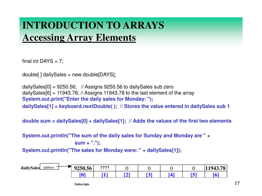 INTRODUCTION TO ARRAYSAccessing Array Elements Each element of an array, when accessed by its subscript, can be used like an individual variable. The individual elements of the dailySales array are variables of type double, we can write statements like the following: final int DAYS = 7; double[ ] dailySales = new double[DAYS]; dailySales[0] = 9250.56; // Assigns 9250.56 to dailySales sub zero dailySales[6] = 11943.78; // Assigns 11943.78 to the last element of the array 16 16
