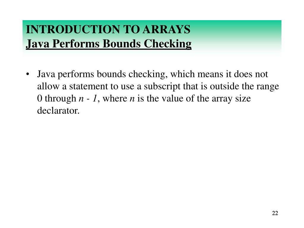 INTRODUCTION TO ARRAYSJava Performs Bounds Checking Java performs bounds checking, which means it does not allow a statement to use a subscript that is outside the range 0 through n - 1, where n is the value of the array size declarator. 22 22