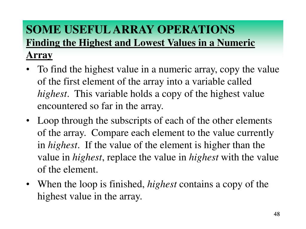 SOME USEFUL ARRAY OPERATIONS Finding the Highest and Lowest Values in a Numeric Array To find the highest value in a numeric array, copy the value of the first element of the array into a variable called highest. This variable holds a copy of the highest value encountered so far in the array. Loop through the subscripts of each of the other elements of the array. Compare each element to the value currently in highest. If the value of the element is higher than the value in highest, replace the value in highestwith the value of the element. When the loop is finished, highest contains a copy of the highest value in the array. 48 48