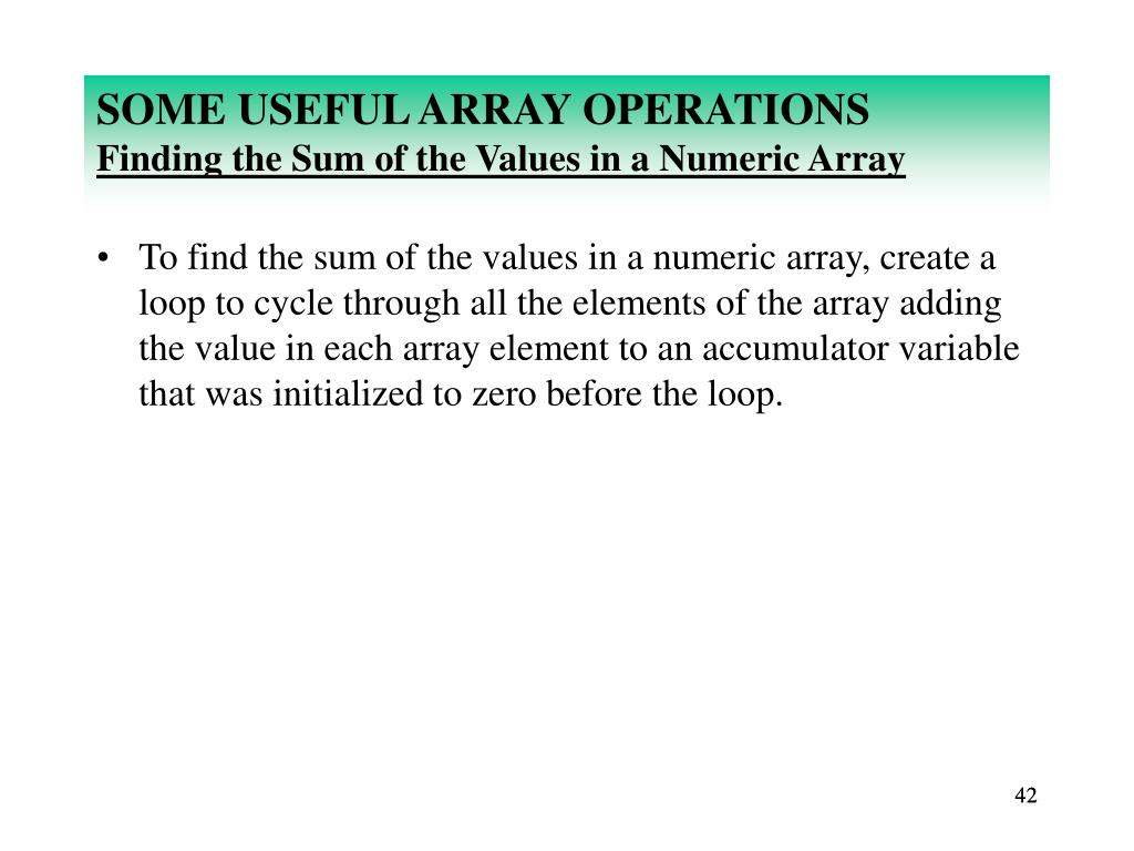SOME USEFUL ARRAY OPERATIONS Finding the Sum of the Values in a Numeric Array To find the sum of the values in a numeric array, create a loop to cycle through all the elements of the array adding the value in each array element to an accumulator variable that was initialized to zero before the loop. 42 42