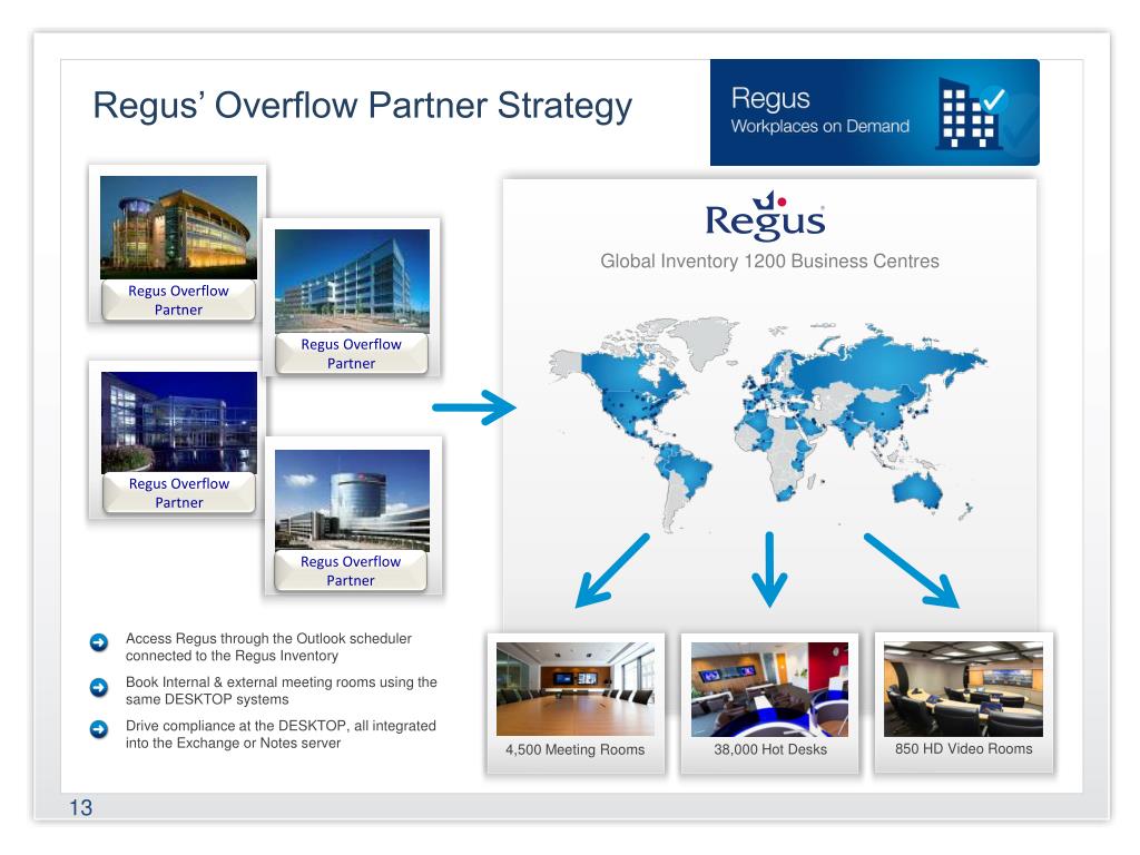 Regus’ Overflow Partner Strategy Global Inventory 1200 Business Centres Regus Overflow Partner 4,500 Meeting Rooms Regus Overflow Partner Regus Overflow Partner 38,000 Hot Desks Regus Overflow Partner Access Regus through the Outlook scheduler connected to the Regus Inventory Book Internal & external meeting rooms using the same DESKTOP systems Drive compliance at the DESKTOP, all integrated into the Exchange or Notes server 850 HD Video Rooms