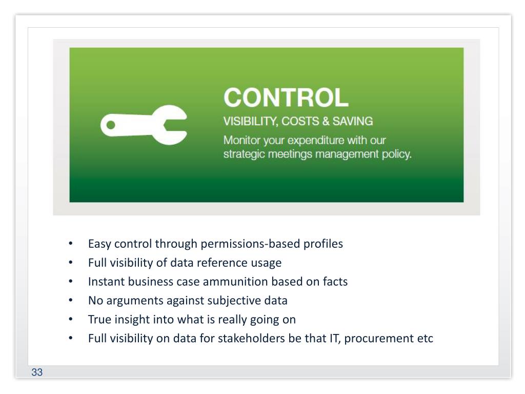 Easy control through permissions-based profiles • Full visibility of data reference usage • Instant business case ammunition based on facts • No arguments against subjective data • True insight into what is really going on • Full visibility on data for stakeholders be that IT, procurement etc