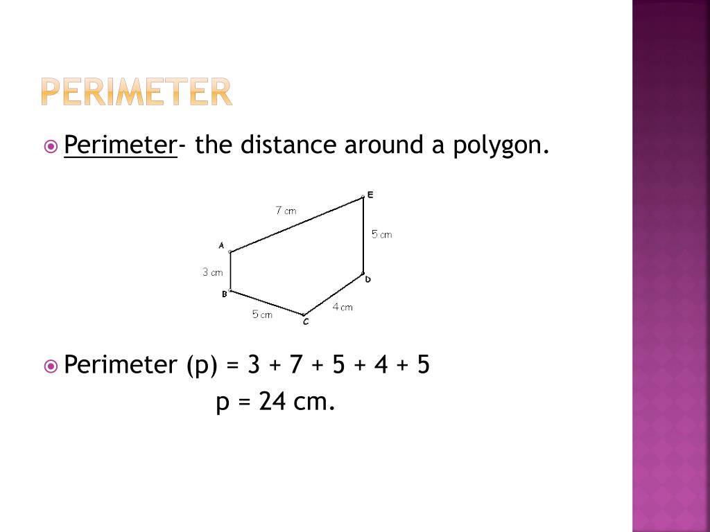 Perimeter • Perimeter- the distance around a polygon. • Perimeter (p) = 3 + 7 + 5 + 4 + 5 p = 24 cm.