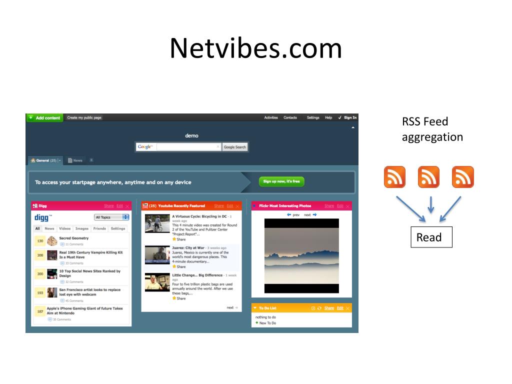 Social Bookmarking • A method for Internet users to store, organize, search, and manage bookmarks of web pages on the Internet with the help of metadata. • Based on communities; • The more people who bookmark a piece of content, the more value it is determined to have. • Examples: Digg, Del.icio.us, StumbleUpon, and Reddit,