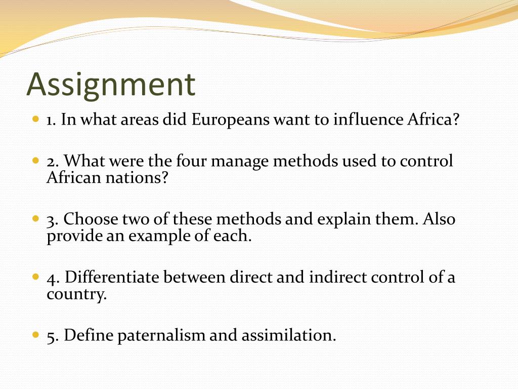 Assignment • 1. In what areas did Europeans want to influence Africa? • 2. What were the four manage methods used to control African nations? • 3. Choose two of these methods and explain them. Also provide an example of each. • 4. Differentiate between direct and indirect control of a country. • 5. Define paternalism and assimilation.