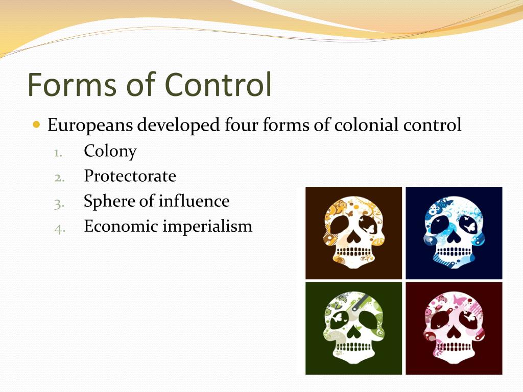 Forms of Control • Europeans developed four forms of colonial control • Colony • Protectorate • Sphere of influence • Economic imperialism
