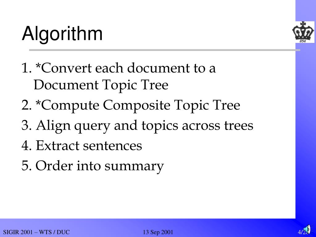 Algorithm 1. *Convert each document to a Document Topic Tree 2. *Compute Composite Topic Tree 3. Align query and topics across trees 4. Extract sentences 5. Order into summary