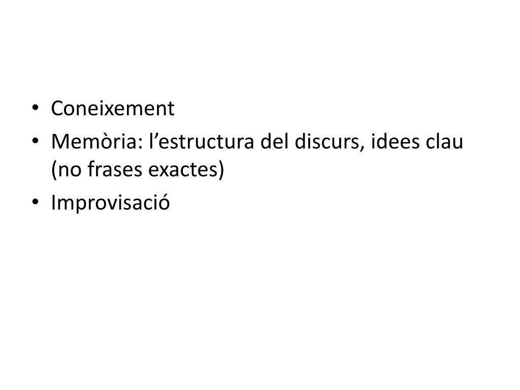 Coneixement • Memòria: l’estructura del discurs, idees clau (no frases exactes) • Improvisació