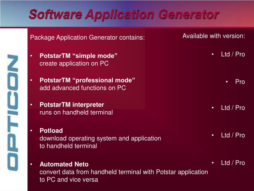 Software Application Generator Package Application Generator contains: PotstarTM “simple mode”create application on PC PotstarTM “professional mode”add advanced functions on PC PotstarTM interpreterruns on handheld terminal Potloaddownload operating system and applicationto handheld terminal Automated Netoconvert data from handheld terminal with Potstar applicationto PC and vice versa Available with version: • Ltd / Pro • Pro • Ltd / Pro • Ltd / Pro • Ltd / Pro